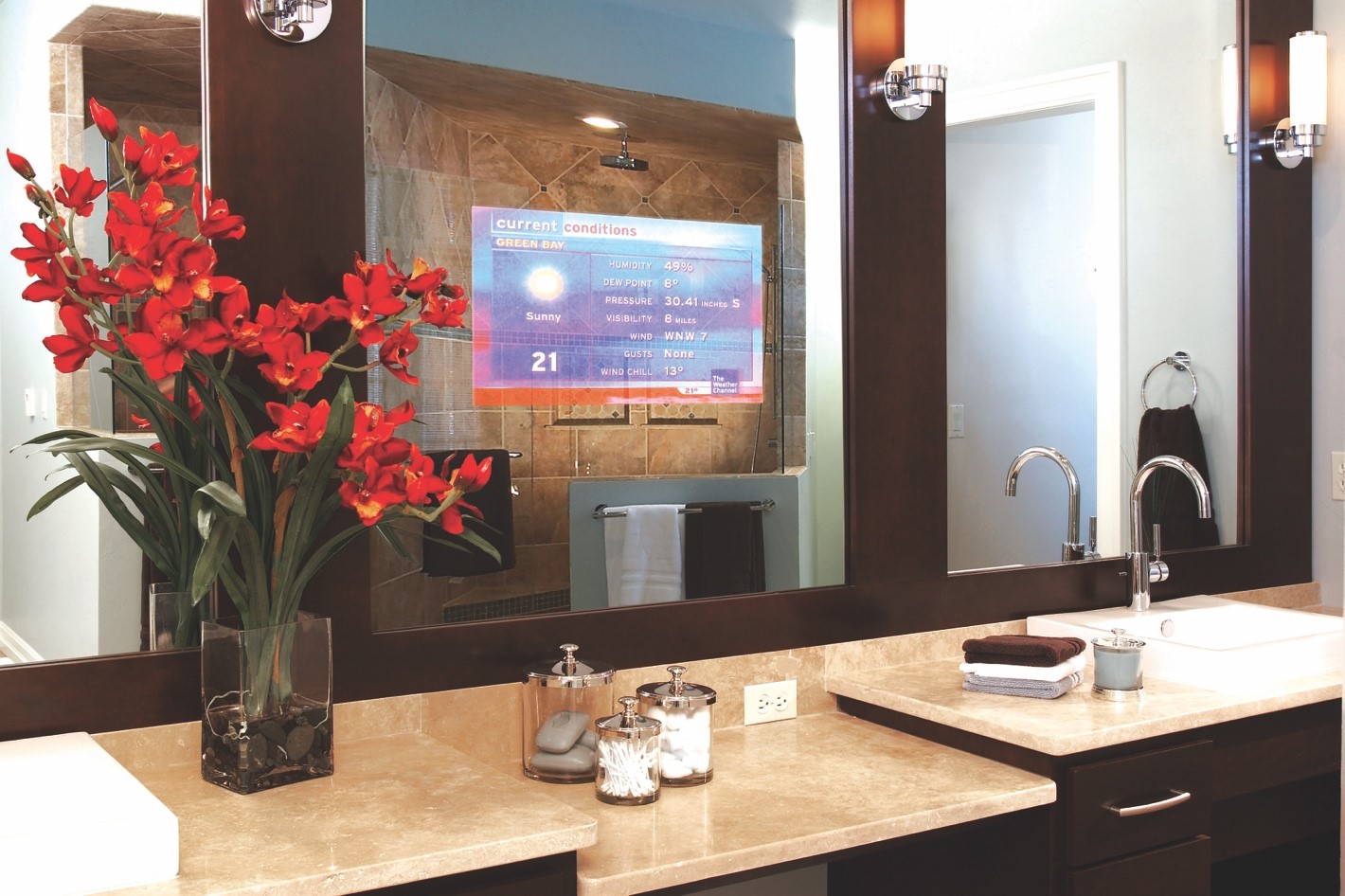 Speaking of mirrors, the same approach is popular to integrate a TV into a bath area.  Perhaps your clients might like to turn on the morning news as they get ready in the morning, but hanging a TV in a bathroom just isn’t going to fit in.  A smaller TV (like a 32-43-inch model) can be integrated behind a mirror.  The sound could be piped through stereo speakers in the ceiling. Using a little home automation, we could also have your clients’ favorite channel going, the lights and motorized shades up, and the coffee brewing as they start their morning routine.